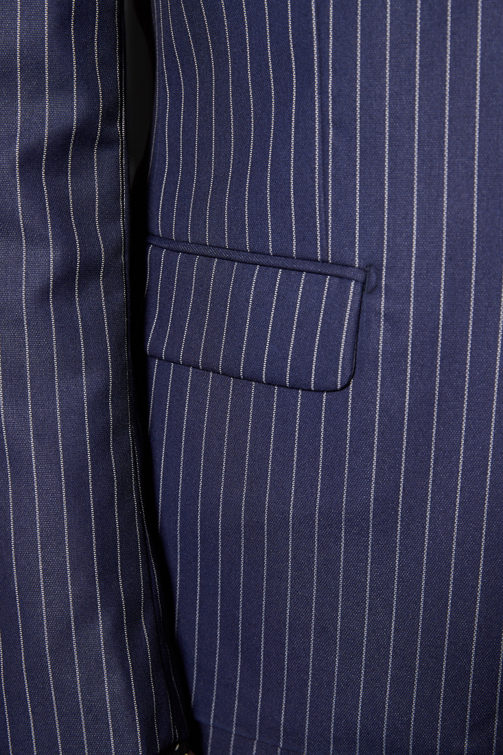 深藍白豎紋西裝搭配上專業研發出的合身剪裁設計,讓深色系西裝可以修飾身形,呈現視覺顯瘦完美比例。